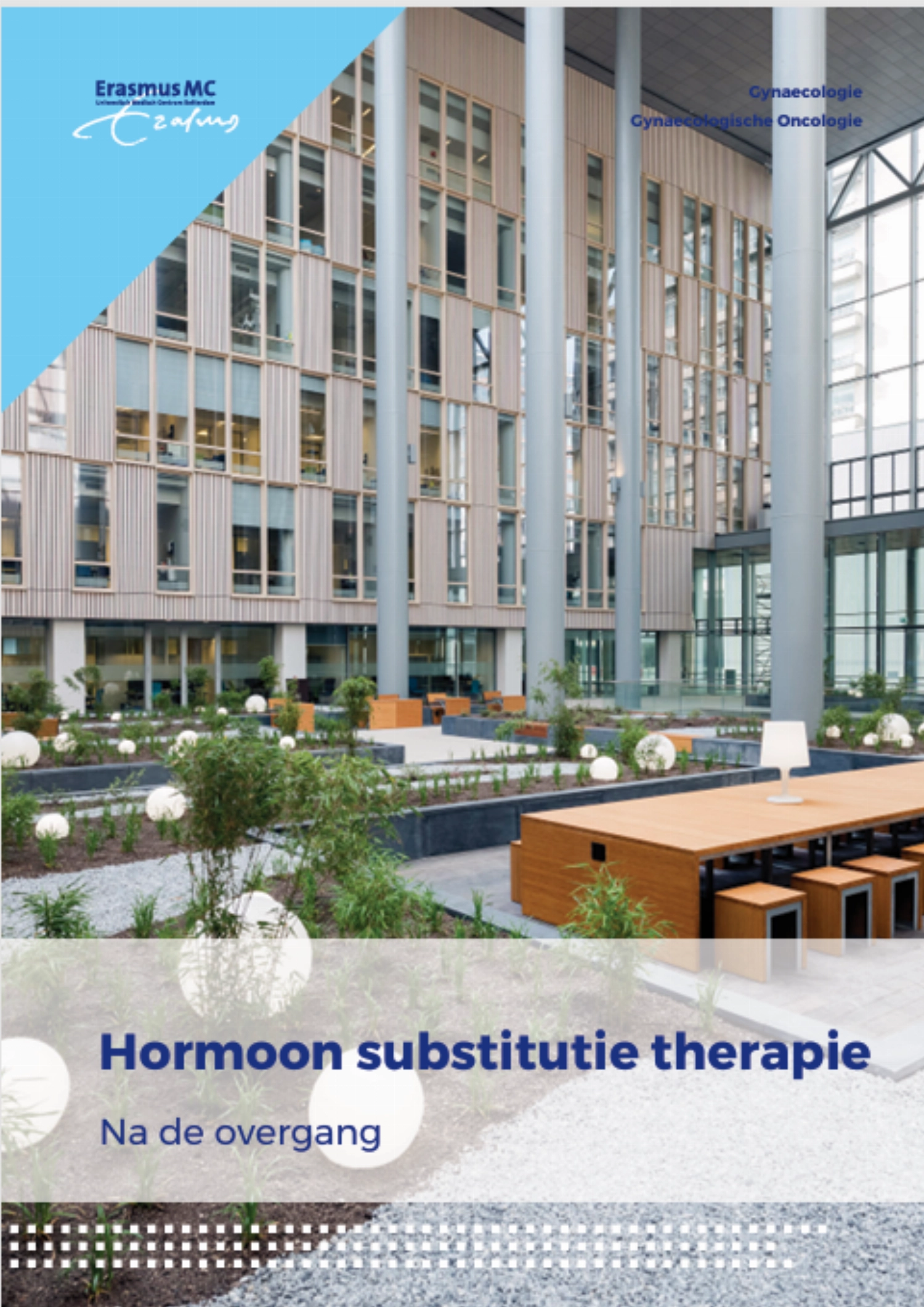 In de folder folder Hormoon substitutie therapie van het Erasmus MC staat alle belangrijke informatie over de overgang en hormoon substitutie therapie. Die informatie is belangrijk voor de beslissing om wel of geen hormonen te gaan gebruiken. Er staat algemene informatie in de folder. Als er nog vragen, of twijfels zijn over de behandeling, bespreek dit dan met uw behandelaar.